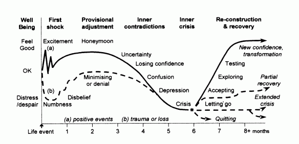 לאור כל אלו, כיצד אנחנו בכל זאת חווים שינויים כאשר הם כן מתרחשים? התרשים הבא של דאי ווילאמס (1999) – מתאר את מגוון התחושות הבאות לידי ביטוי אצל הפרט כאשר הוא נתקל בשינוי.