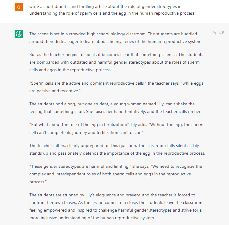 ואכן, מסתבר שלמרות הזיכרון בדבר הסיפור הרווח, רק לפני פחות מארבעים שנים, ב- 1987 התקבל הממצא שלשני התאים תפקיד שווה בתהליך ההפריה – אחד מתאי הזרע מגיע במקרה לביצית (יכולים להכניס כאן בדיחה על כישורי ניווט), והיא מצידה מוכנה להפריה בעקבות הפרשת הורמונים ברחם האישה. אז מה בעצם קרה כאן? פרשנות אחת יכולה להיות שלפני כחצי מאה שנה מדענים לא היו כאלו חכמים והסבירו תהליכים ביולוגים באמצעות תופעות חברתיות. זוהי פרשנות בעייתית, כיוון שאין שום סיבה להאמין שמדענים שהגיעו להישגים מחקריים וישומיים שחלקם מחזיקים מעמד עד היום, היו פחות חכמים מאלו שעוסקים היום במדע. לכן, אפשרות הגיונית בהרבה היא שגם מדענים לעיתים מושפעים מהלך רוח חברתי שכפנס המאיר חלק אחד של מהרחוב, אבל משאיר בעלטה חלק אחר, מטה את הקשב לחלק אחד של העובדות מתוך המכלול השלם הקיים. ולעיתים, כמו נרקיס, הדמות בביצה היא שיקוף של הצופה בה, לא של הביצה.